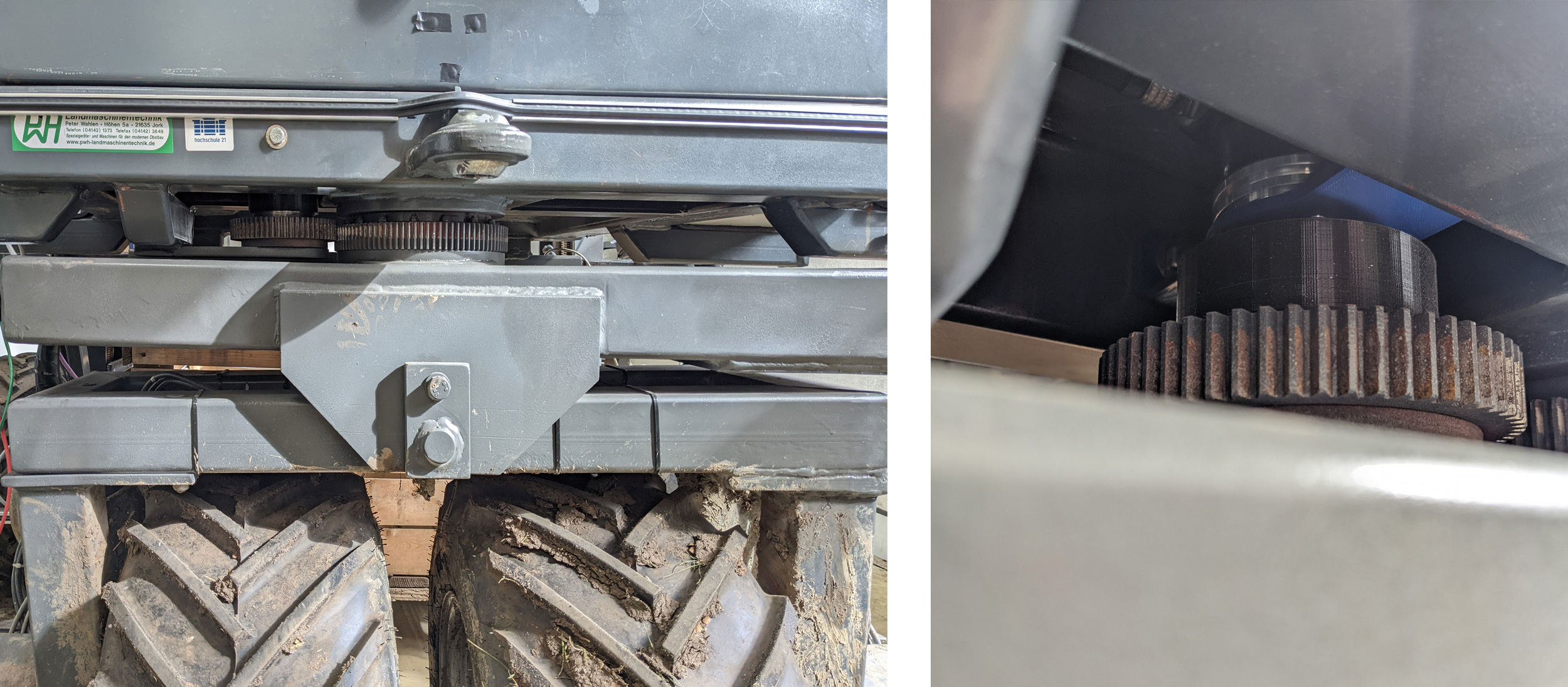 Am hinteren Teil des Gefährts ist ein Doppelrad verbaut, das sich drehen kann und so die Lenkung erzeugt. Der Lenkwinkel wird durch den magnetischen Drehgeber WV5800M aufgenommen, verarbeitet und an die Steuerung gesendet. Es handelt sich um einen Multiturn-Drehgeber, mit dem auch mehrere Umdrehungen absolut erfasst werden können. Sollte die Spannung einmal unterbrochen werden, z. B. weil die Akkus leer sind, ist der zuvor eingestellte Lenkwinkel immer noch vorhanden. Ohne Absolutwertgeber würde dieser beim erneuten Hochfahren des Fahrzeugs fälschlicherweise als Null-Grad-Winkel definiert werden. Das magnetische Messprinzip kommt den Anforderungen an Robustheit und Unempfindlichkeit entgegen. Überzeugt hat das Projektteam auch die hohe Präzision und Zuverlässigkeit des Drehgebers, damit das Fahrzeug stets den Lenkwinkel so anpasst, dass es seinen definierten Pfad umsetzen kann – ohne Ausfallerscheinungen und zu große Toleranzen.