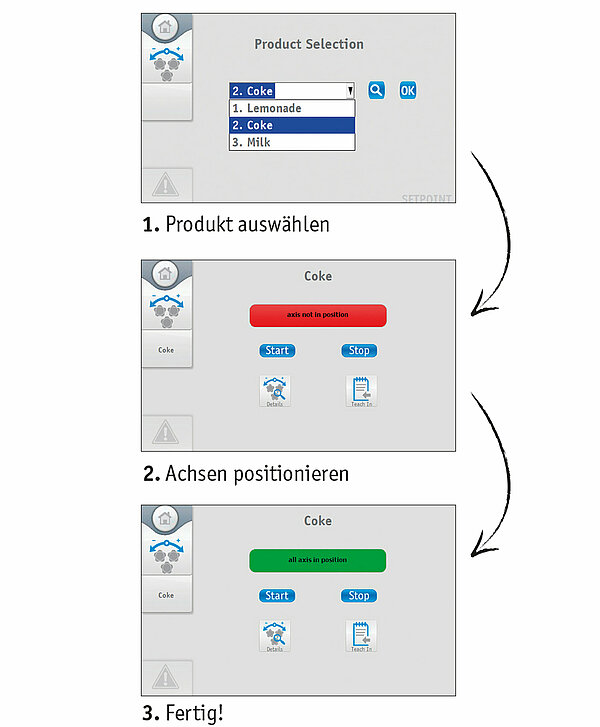 Im laufenden Betrieb lässt sich damit eine Vielzahl von Rezepten für verschiedene Produkte vorgeben. Automatisch werden dann Soll-Werte an alle Achsen oder Linearverstellpositionen gesendet, die vom Positionierantrieb automatisch angefahren oder eben mit einer elektronischen Positionsanzeige manuell verstellt und überwacht werden können. Der Automatisierungsgrad der Maschine ist dabei individuell zu bestimmen. Die vorprogrammierte Bedienoberfläche lässt dennoch Raum für die Einrichtung und Programmierung individueller Einstellungen.