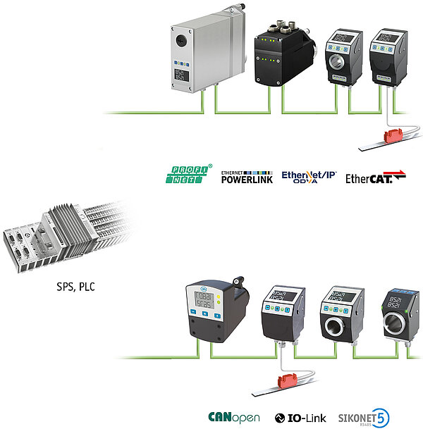 This makes it possible to program the machine so that it only resumes production when all positions are correctly set after format adjustment. Bus capability of the position indicators is decisive, so that the machine control can read and monitor the position values. Thanks to bus capability, the machine controller receives the actual values from the position indicator (reading) and can in turn predetermine the setpoint values (writing).